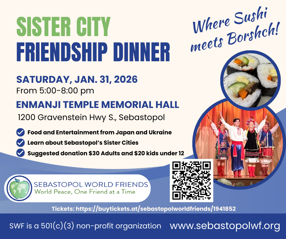 - Saturday, Jan. 31 2026 – Where Sushi Meets Borshch! Annual Sister City Friendship Dinner Tickets!